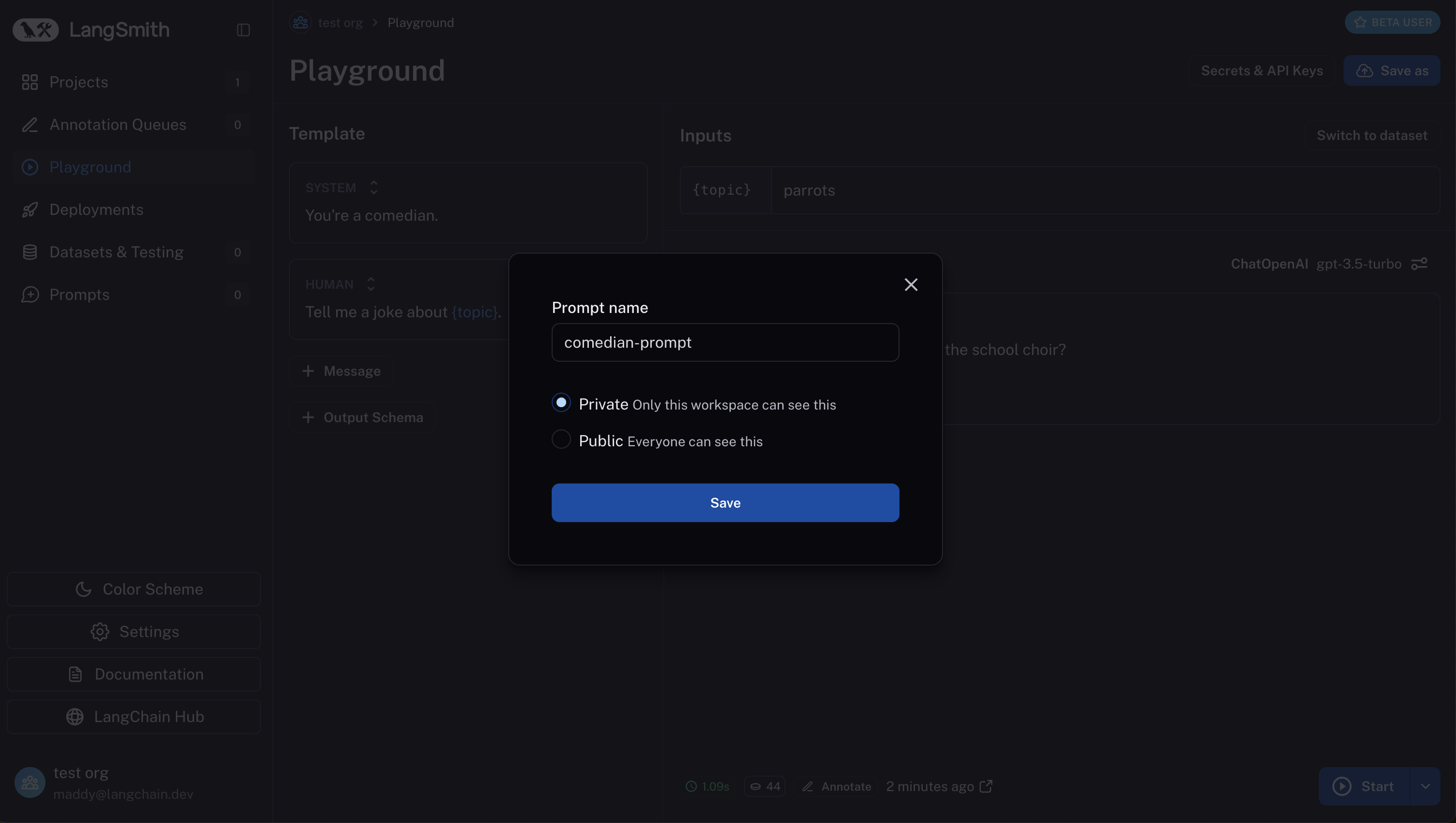To save your prompt, click the "Save as" button, name your prompt, and decide if you want it to be "private" or "public". Private prompts are only visible to your workspace, while public prompts are discoverable to anyone in the LangChain Hub. Click save to create your prompt.