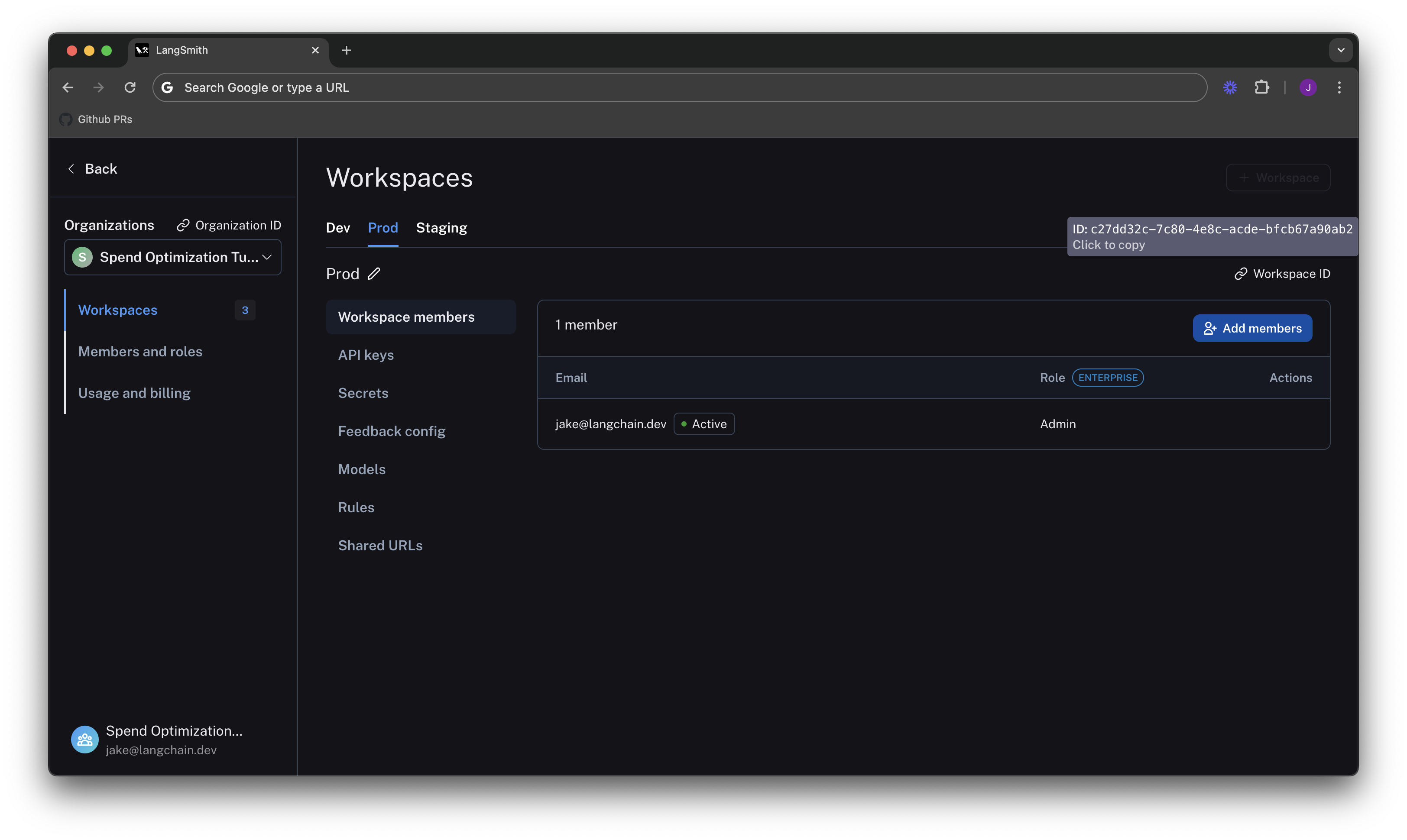 In the above image, the vast majority of usage is in the workspace with ID c27dd32c-7c80-4e8c-acde-bfcb67a90ab2. We can go to Settings -> Workspaces, and hover our mouse over the Workspace ID button to find the one with a matching ID. In this case, it's the Prod workspace: